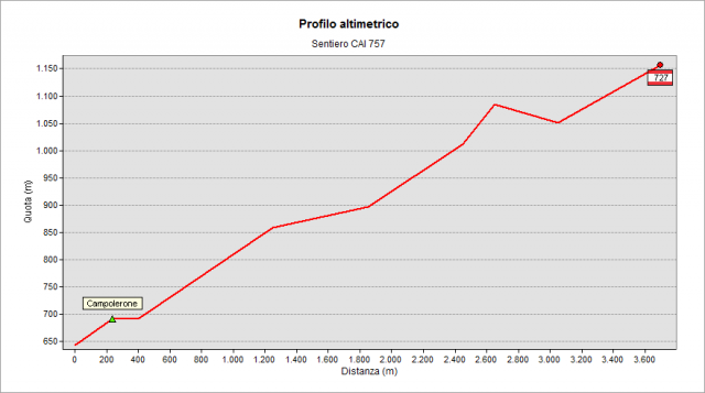 Il percorso diparte dal sentiero 701 in località Campolerone (648 m), seguendo per quasi tutta la sua lunghezza una strada silvo - pastorale. Taglia poi trasversalmente la parte bassa di un bosco misto di conifere e latifoglie che, per la sua localizzazione e i suoi caratteri ambientali, offre la possibilità di una tranquilla passeggiata negli ambienti ombrosi della Vallina.