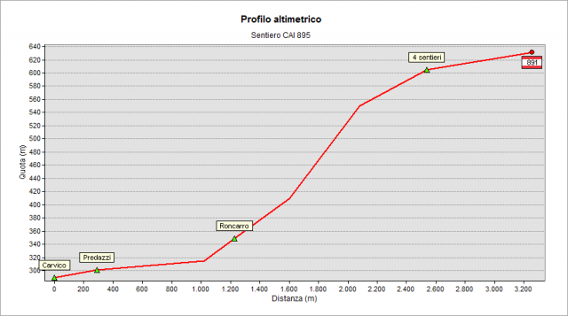 Lungo tutto il percorso si incrociano varie stradine laterali e quindi occorre prestare attenzione ai segnavia CAI. Si prosegue per un breve tratto in salita su gradoni di pietra e poi in falsopiano sino a raggiungere la parte alta della località Roncarro; da qui si svolta a sinistra. Sul percorso si incontra la località Falò. Mantenendosi sul sentiero diritto verso nord sempre in salita, si arriva all' INCROCIO DEI 4 SENTIERI, dove quello a sinistra porta a Tassodine e quello dritto porta al Crocione ed alla Cima del Monte Canto 700 mt. Noi dobbiamo svoltare a destra, la salita si fa meno impegnativa e, dopo un tratto pianeggiante il Sentiero N° 895 termina. Qui si imbocca il sentiero 891, dove girando a sinistra si sale direttamente alla Cima del Monte Canto e poi al Crocione, scendendo sino al traghetto leonardesco di Villa d'Adda.