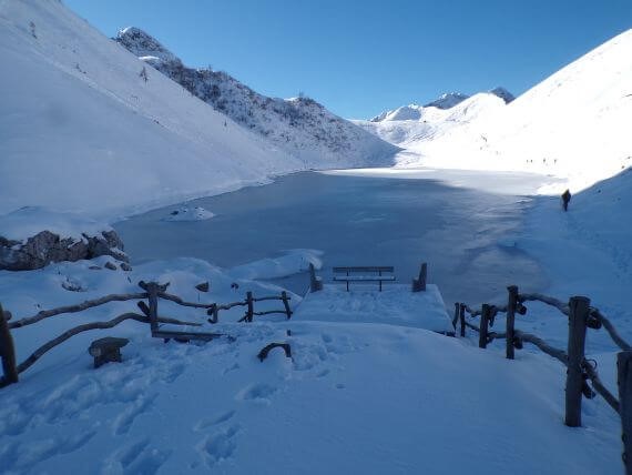 Oltrepassata l’ultima baita il tracciato diventa più ripido e si prende rapidamente quota fino al Lago, situato a 1784 metri di quota. Se la situazione della neve e le condizioni meteorologiche consentono di proseguire in totale sicurezza, saliamo al Passo Branchino costeggiando il lago e percorrendo l’ultimo breve tratto di salita.