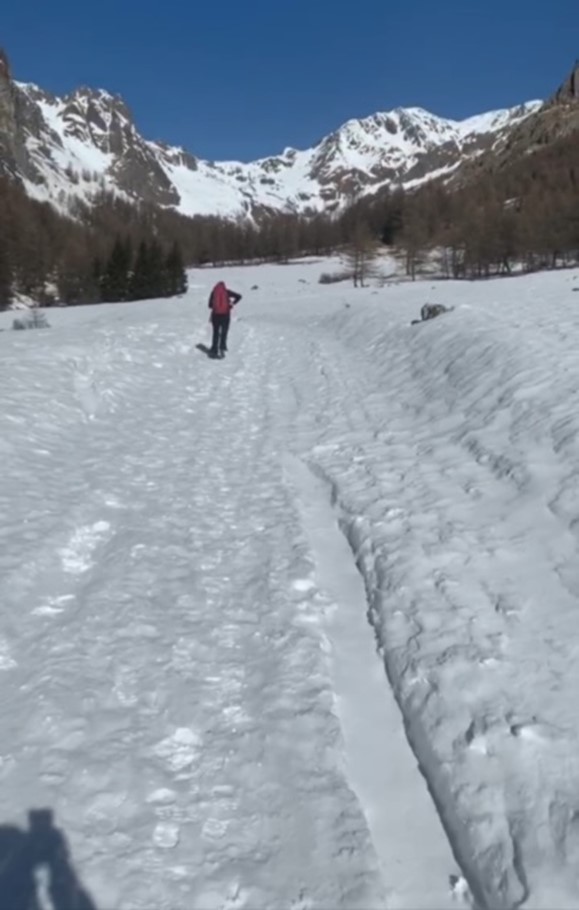 Ci incamminiamo su strada semipianeggiante per circa 1km fino alla frazione Premia (1500mslm) costituita da una ventina di piccole costruzioni in pietra ben restaurate trasformate da costruzioni agricole a seconde case per lo più dagli abitanti di Vione. Riprendiamo il cammino sul sentiero 103 (la via del lac) fino a case Saline, imbocchiamo il sentiero 11 Stambec per case Vialazzo ed oltre fino a Cortebona (1770mslm), Da qui si imbocca il sentiero di fondovalle (185) e oltrepassato il ponticello sul torrente Flumeco si imbocca sulla destra il sentiero che possiamo percorrere con le ciaspole fino al Plazzo della Casera (1950mslm), punto di arrivo della nostra escursione che raggiungiamo comodamente in tre ore dalla partenza, a meno di variate condizioni del terreno. Coloro che preferiscono non utilizzare le ciaspole proseguiranno sul percorso battuto da precedenti escursionisti prestando attenzione a non uscire dal tracciato per non sprofondare: obbligo di impiego di ramponi/ramponcini. I due percorsi si riuniscono dopo 600 metri; dopo ulteriori 600 metri si giunge alla magnifica conca denominata Plazzo della Casera.