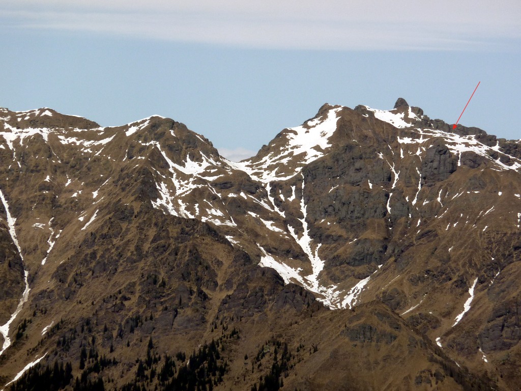 Immagine Note dell'autore La Bocca di Trona, preceduta dalla testata della Val Pianella. La freccia rossa indica invece il rifugio Benigni. Soggetto Sentiero 136: Foppelle (Camerata Cornello) - Passo di Grialeggio Data scatto 24 Aprile, 2016