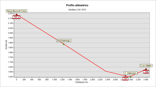 Then, crossed the creek, reach the Nicola hut (1840 m), nearly a ruin but still useful as emergency shelter. The hut is surrounded by several streams flowing into the main course of the nearby creek. Here begins the striking part of the track in Val Pianella. You walk in a morainic basin surrounded by the cliffs Giacomo Peak and Torrione S. Giacomo. In the pastures of the ruined Pastrengo hut you can appreciate the results of the hard work of cleaning the meadows from stones to get more room for the pastures. The path makes a wide turn to bypass some ribs, then crosses some meadows and finally runs near the morainic crests near the slopes of Pascaniello mount. Here the path climbs steeply heading northward in the upper part of the valley (pay attention to small landslides caused by snowfalls). After a hump you get the basin at the top of the valley under the Val Pianella Peak. From here go straight ahead heading northward to Bocchetta di Trona (pass at 2224 m, crossroad of 101 path) to watch Trona valley overhung by the pyramid of Trona peak (2510 mt). On 101 path you can reach, eastward, toward Rifugio Benigni, the crossroad with 108A path, leading you back to the starting point of 107A path