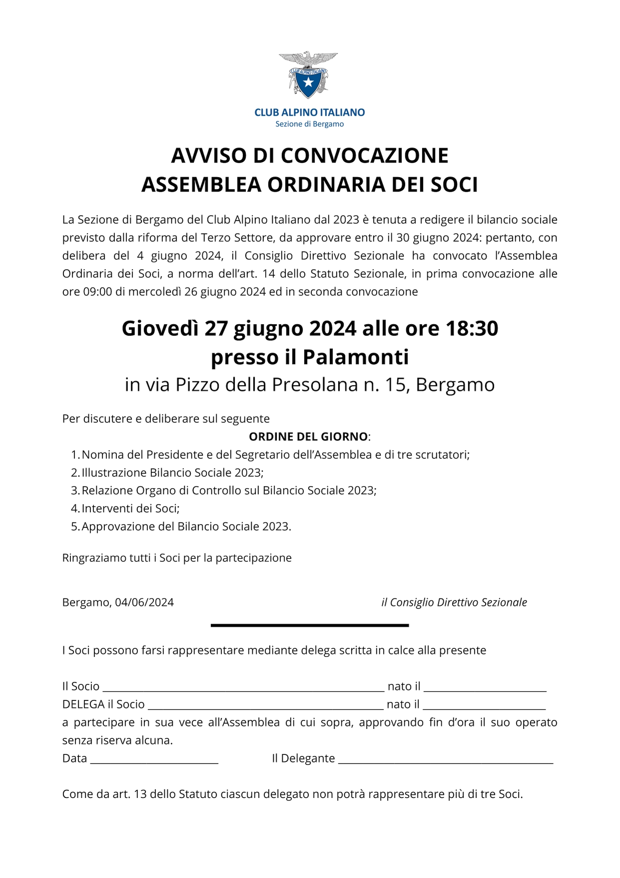 Sezione di Bergamo Antonio Locatelli Giovedì 27 Giugno Cosa Convegno / incontro Allegati Convocazione assemblea giugno 2024 2024-06-10 21_25_48.pdf Quando Quando Gio, 27/06/24, 18:30 - 19:30 Dove Luogo di svolgimento via pizzo della presolana 15 24125 Bergamo BG Italia