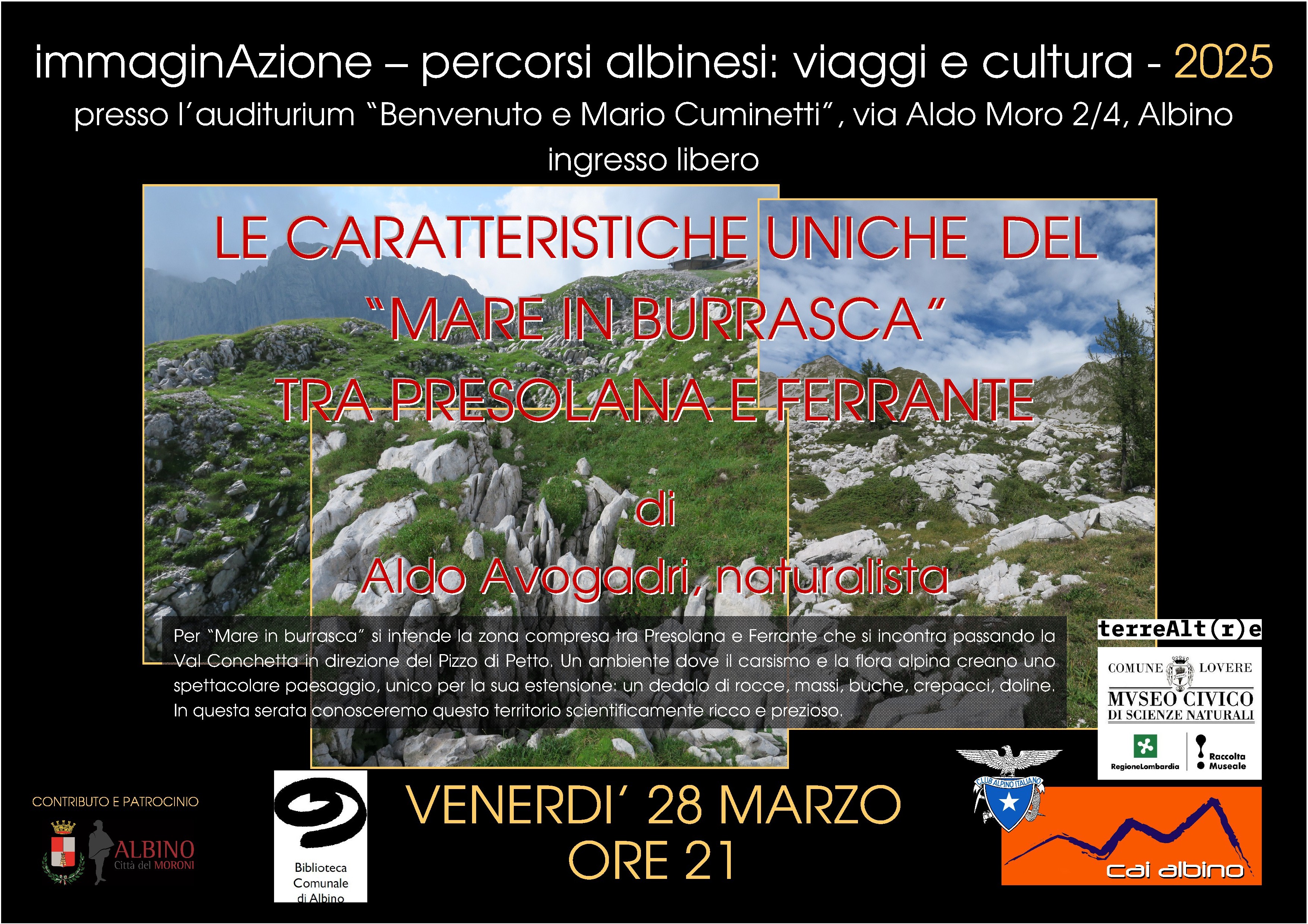 Venerdì 29/03 alle ore 21 presso Auditorium si terrà un convegno con il Prof. Avogadri, naturalista, alla scoperta delle bellezze uniche geologiche e ambientali del Mare in Burrasca, nella zona della Presolana