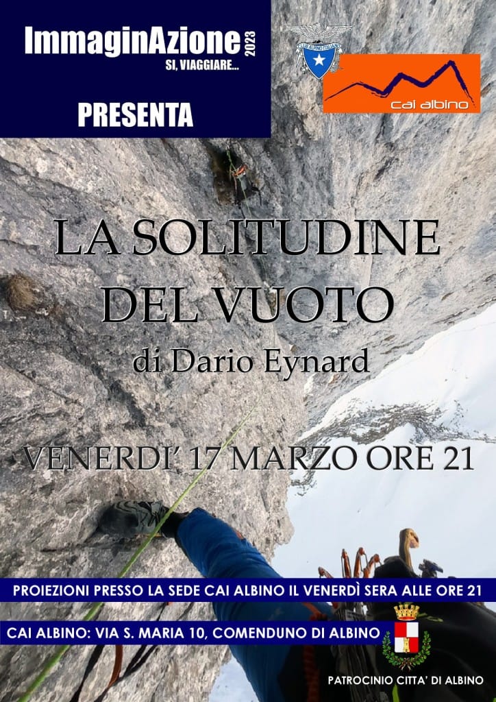 Sottosezione di Albino Venerdì 17 Marzo Cosa Dario Eynard, giovane alpinista bergamasco sarà ospite della 7^ serata della rassegna "ImmaginAzione" e ci farà provare il brivido dell'arrampicata in solitaria. Allegati 07_Locandina ImmaginAzione 2023 EYNARD.pdf Quando Quando Ven, 17/03/23, 21:00 - 23:00