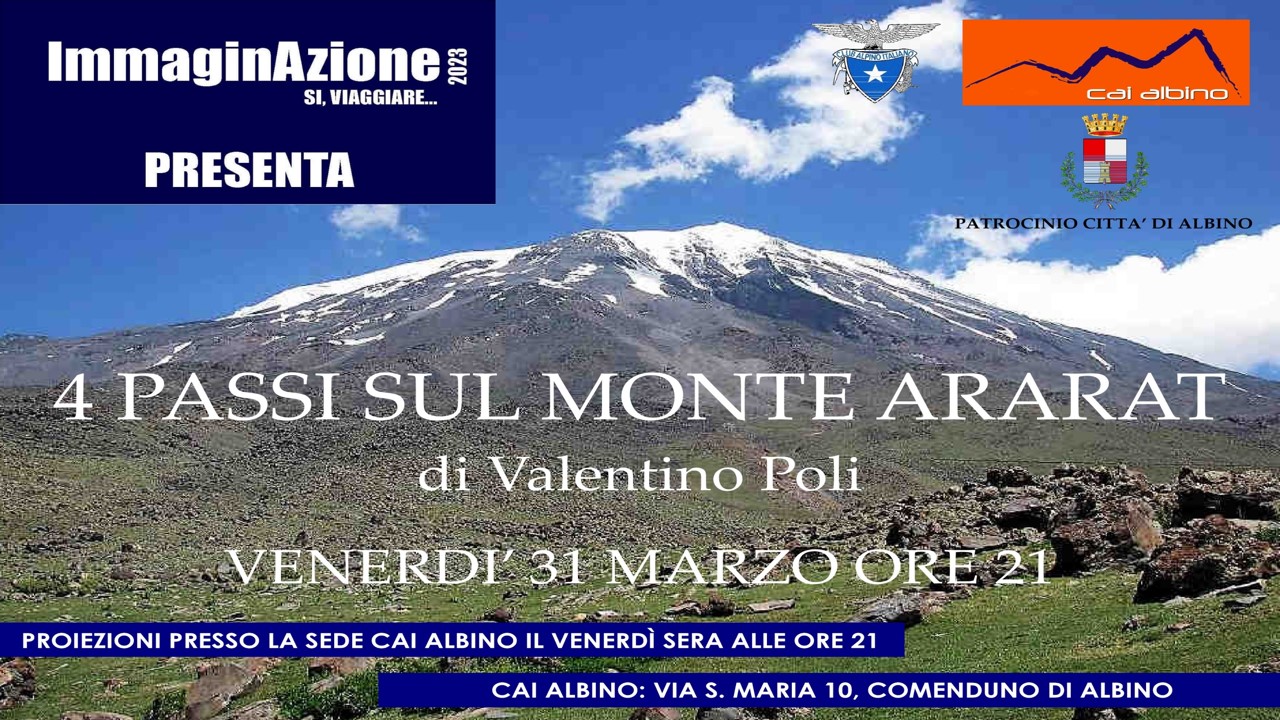 Sottosezione di Albino Venerdì 31 Marzo Cosa Valentino Poli ci porterà alla ricerca dei resti dell'arca di Noè sul monte Ararat, cima più alta della Turchia (5137 m.) e montagna sacra ai Curdi. Allegati 08_Locandina ImmaginAzione 2023 ARARAT (2).pdf Quando Quando Ven, 31/03/23, 21:00 - 23:00