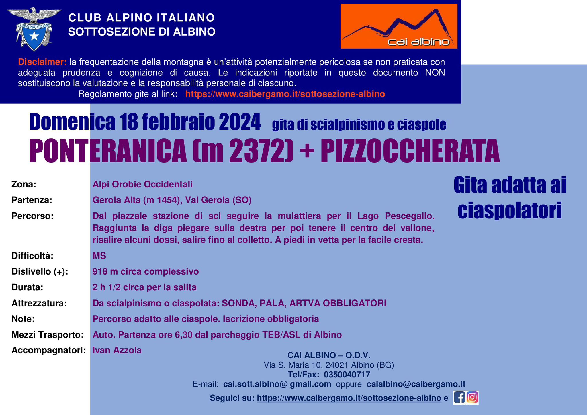 Sottosezione di Albino Domenica 18 Febbraio Cosa Uscita in ambiente Gita scialpinistica al Monte Ponteranica dalla Valgerola Gita aperta anche a escursionisti con ciaspole Quando Quando Dom, 18/02/24, Tutto il giorno