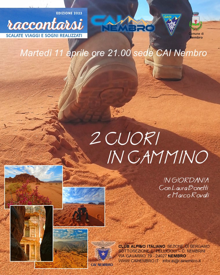 Sottosezione di Nembro Martedì 11 Aprile Cosa Convegno / incontro Giordania con Laura Bonetti e Marco Rovati Allegati 2 cuori in cammino3.pdf Quando Quando Mar, 11/04/23, 21:00 - 23:00 Dove Luogo di svolgimento via Gavardo 79 24027 nembro BG Italia