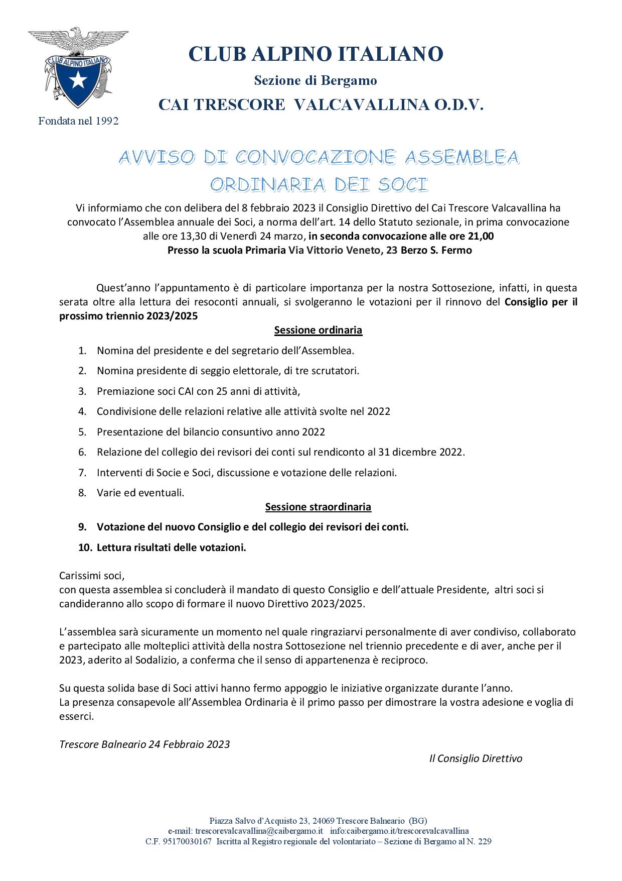 Cari soci, vi informiamo che con delibera del 8 febbraio 2023 il Consiglio Direttivo del Cai Trescore Valcavallina ha convocato l’Assemblea annuale dei Soci, a norma dell’art. 14 dello Statuto sezionale, in prima convocazione alle ore 13,30 di Venerdì 24 marzo, in seconda convocazione alle ore 21,00 Presso la scuola Primaria Via Vittorio Veneto, 23 Berzo S. Fermo