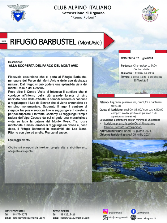 Sottosezione di Urgnano "Remo Poloni" Domenica 07 Luglio Cosa Uscita in ambiente Allegati BARBUSTEL_0.pdf Quando Quando Dom, 07/07/24, Tutto il giorno Dove Luogo di svolgimento 11020 Champdepraz AO Italia Partecipare Apertura delle iscrizioni Mar, 11/06/24 - Gio, 04/07/24, Tutto il giorno Se è indicata l'ora di chiusura delle iscrizioni, questa è tassativa Quote di partecipazione Socio CAI LA QUOTA COMPRENDE IL COSTO DEL BUS 35,00