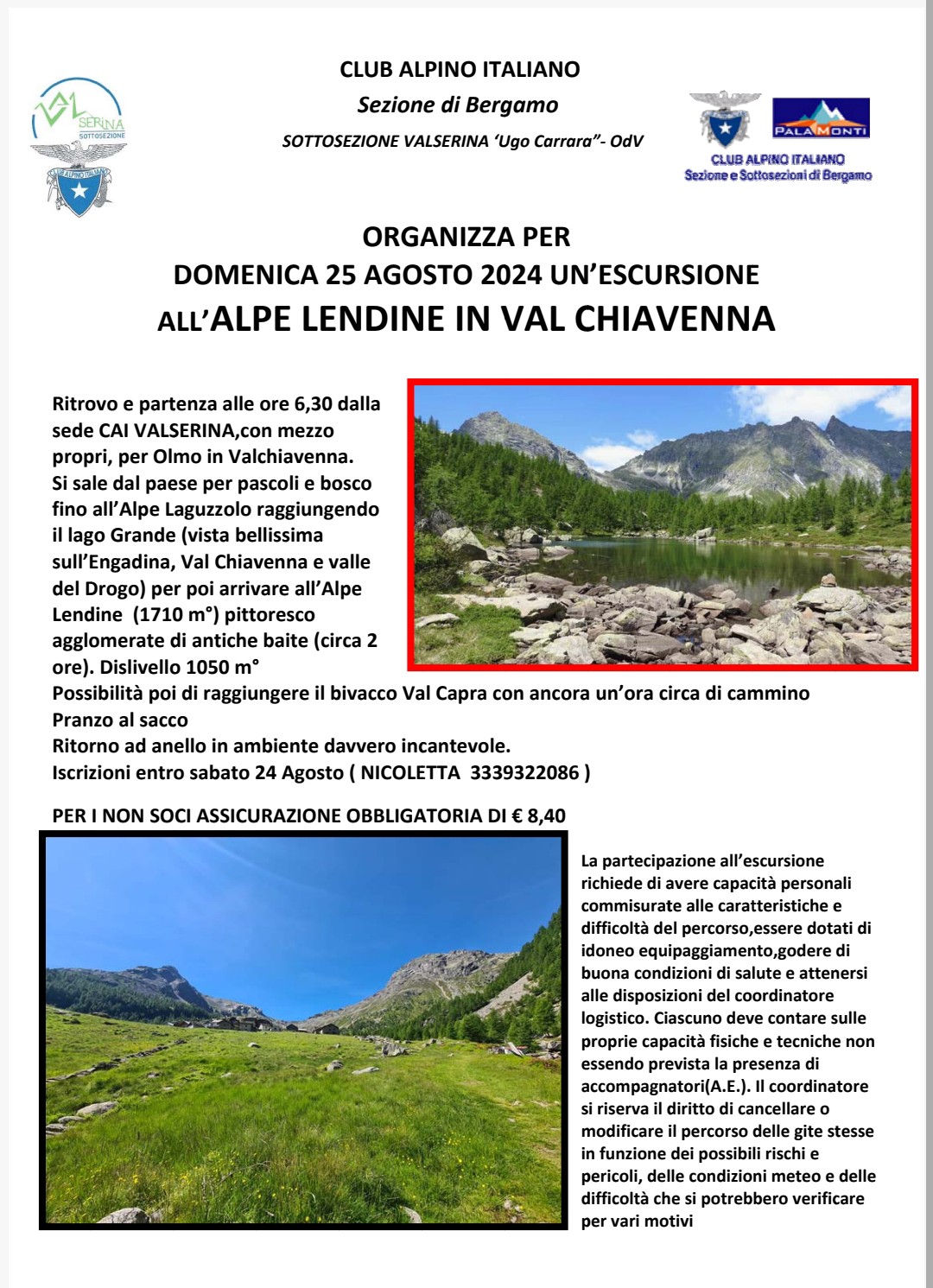 Sottosezione di Valserina Domenica 25 Agosto Cosa Uscita in ambiente Allegati Alpe Lendine 2024.pdf Quando Quando Dom, 25/08/24, Tutto il giorno Partecipare Apertura delle iscrizioni Dom, 18/08/24 - Sab, 24/08/24, Tutto il giorno Se è indicata l'ora di chiusura delle iscrizioni, questa è tassativa
