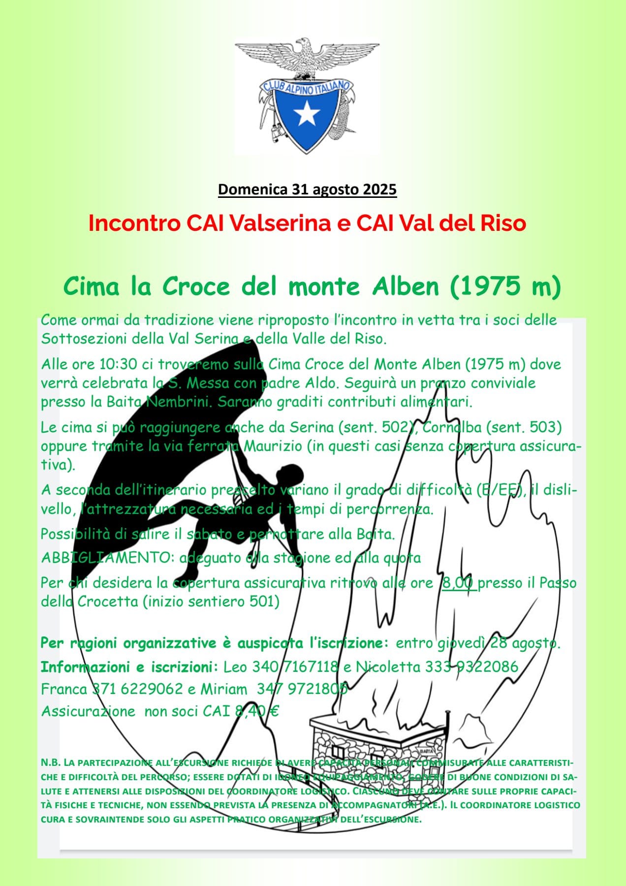 Sottosezione di Valserina Domenica 31 Agosto Cosa Uscita in ambiente Allegati Ritrovo al Nembrini con CAI Valle del Riso 2025-2.pdf Quando Quando Dom, 31/08/25, Tutto il giorno Partecipare Apertura delle iscrizioni Lun, 25/08/25 - Sab, 30/08/25, Tutto il giorno Se è indicata l'ora di chiusura delle iscrizioni, questa è tassativa