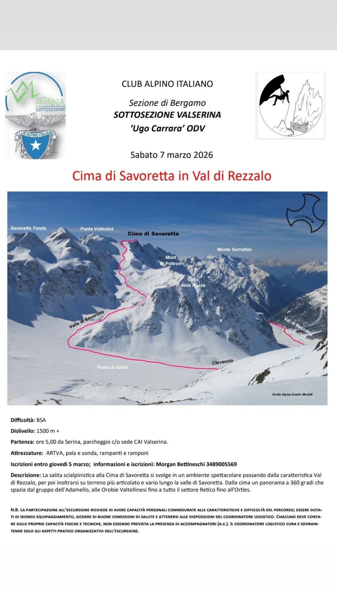 Sottosezione di Valserina Sabato 07 Marzo Cosa Uscita in ambiente Allegati Cima di Savoretta 2026.pdf Quando Quando Sab, 07/03/26, Tutto il giorno Partecipare Apertura delle iscrizioni Dom, 01/03/26 - Ven, 06/03/26, Tutto il giorno Se è indicata l'ora di chiusura delle iscrizioni, questa è tassativa