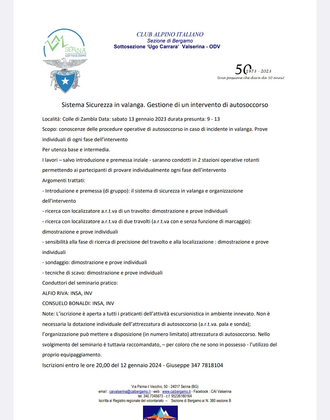 Sottosezione di Valserina Sabato 13 Gennaio Cosa Corso Allegati Esercitazione sulla neve 2024.pdf Quando Quando Sab, 13/01/24, 9:00 - 13:00 Partecipare Apertura delle iscrizioni Dom, 31/12/23 - Ven, 12/01/24, Tutto il giorno Se è indicata l'ora di chiusura delle iscrizioni, questa è tassativa