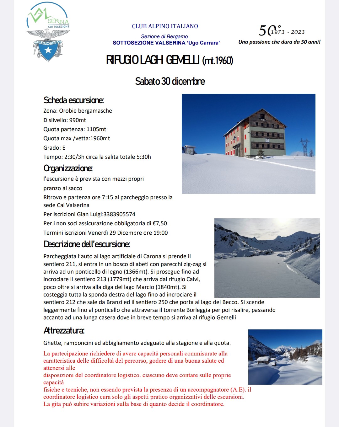 Sottosezione di Valserina Sabato 30 Dicembre Cosa Uscita in ambiente Allegati LAGHI GEMELLI 2023.pdf Quando Quando Sab, 30/12/23, Tutto il giorno Partecipare Apertura delle iscrizioni Dom, 17/12/23 - Ven, 29/12/23, Tutto il giorno Se è indicata l'ora di chiusura delle iscrizioni, questa è tassativa