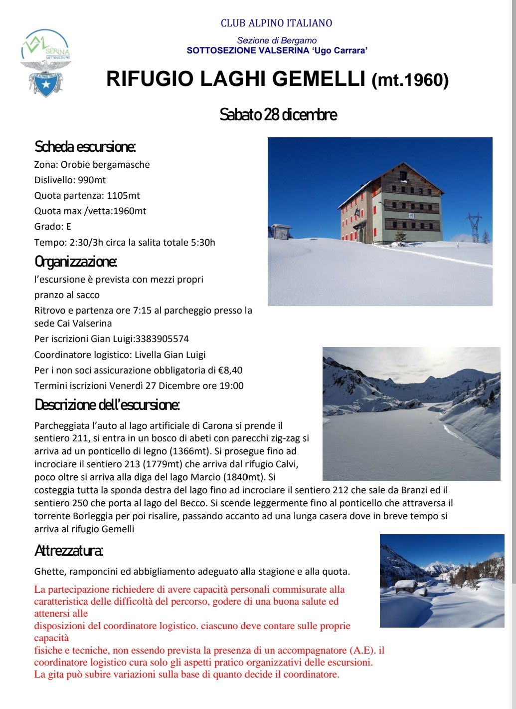 Sottosezione di Valserina Sabato 28 Dicembre Cosa Uscita in ambiente Allegati LAGHI GEMELLI_2024.pdf Quando Quando Sab, 28/12/24, Tutto il giorno Partecipare Apertura delle iscrizioni Mer, 18/12/24 - Ven, 27/12/24, Tutto il giorno Se è indicata l'ora di chiusura delle iscrizioni, questa è tassativa