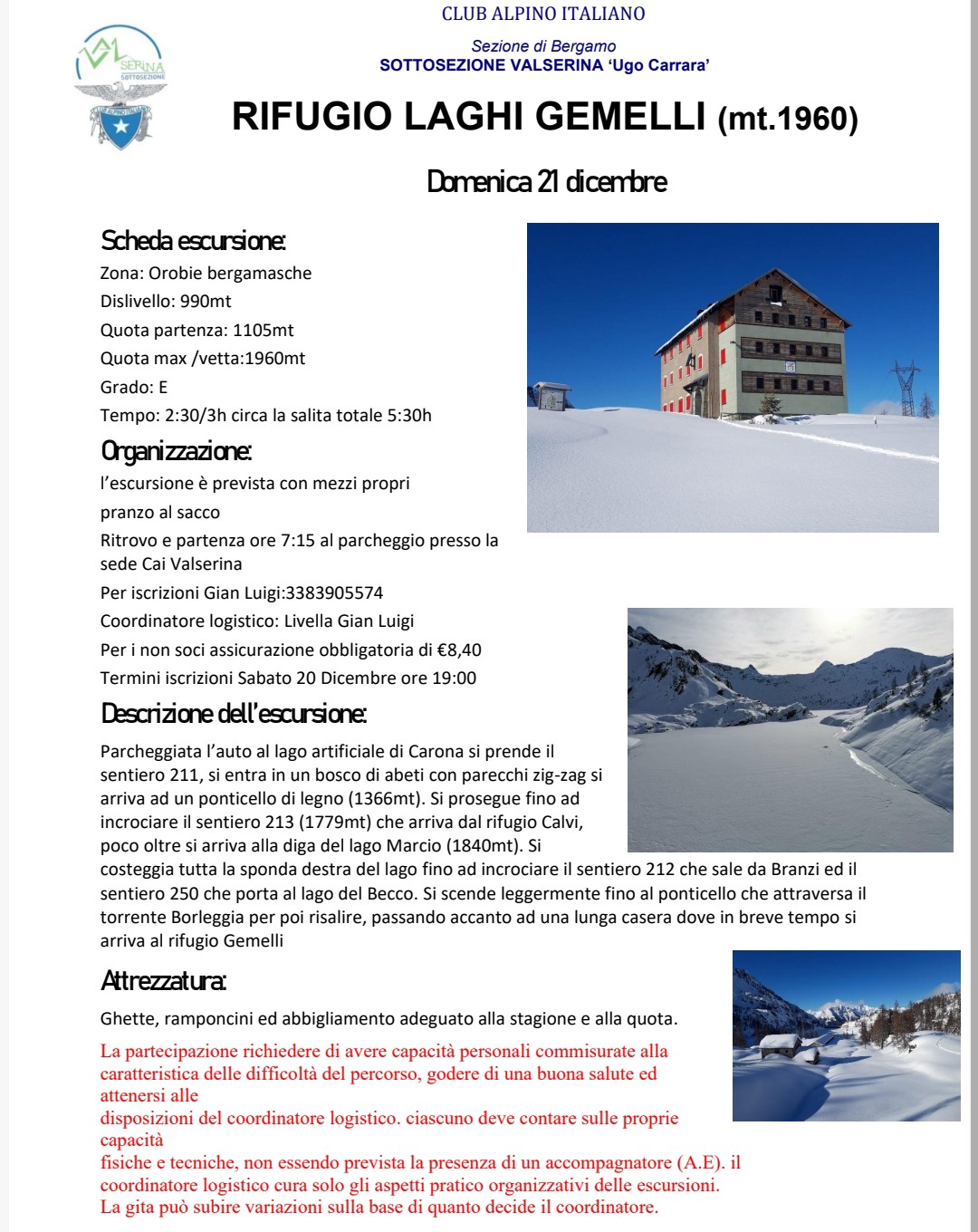 Sottosezione di Valserina Domenica 21 Dicembre Cosa Uscita in ambiente Allegati LAGHI GEMELLI.pdf Quando Quando Dom, 21/12/25, Tutto il giorno Partecipare Apertura delle iscrizioni Lun, 17/11/25 - Sab, 20/12/25, Tutto il giorno Se è indicata l'ora di chiusura delle iscrizioni, questa è tassativa