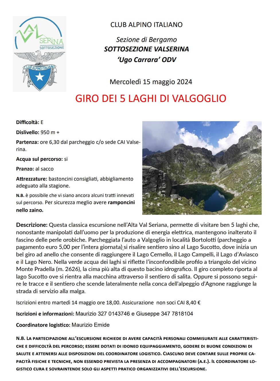 Sottosezione di Valserina Mercoledì 15 Maggio Cosa Uscita in ambiente Allegati Laghi di Valgoglio 2024.pdf Quando Quando Mer, 15/05/24, Tutto il giorno Partecipare Apertura delle iscrizioni Mer, 08/05/24 - Mar, 14/05/24, Tutto il giorno Se è indicata l'ora di chiusura delle iscrizioni, questa è tassativa