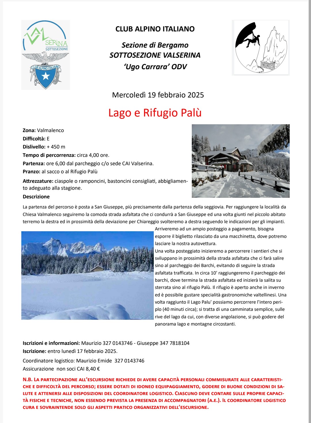 Sottosezione di Valserina Mercoledì 19 Febbraio Cosa Uscita in ambiente Allegati Lago Palù E 2025.pdf Quando Quando Mer, 19/02/25, Tutto il giorno Partecipare Apertura delle iscrizioni Ven, 07/02/25 - Mar, 18/02/25, Tutto il giorno Se è indicata l'ora di chiusura delle iscrizioni, questa è tassativa