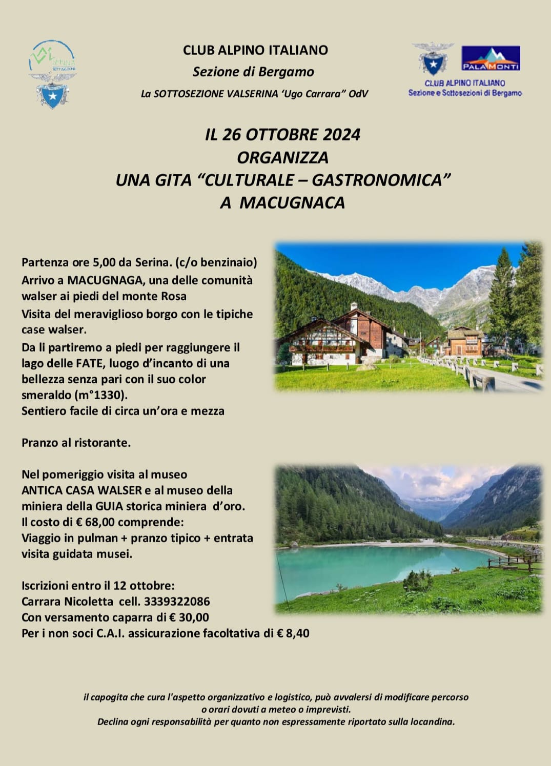 Sottosezione di Valserina Sabato 26 Ottobre Cosa Uscita in ambiente Allegati Macugnaga 2024.pdf Quando Quando Sab, 26/10/24, Tutto il giorno Partecipare Apertura delle iscrizioni Mar, 01/10/24 - Ven, 25/10/24, Tutto il giorno Se è indicata l'ora di chiusura delle iscrizioni, questa è tassativa