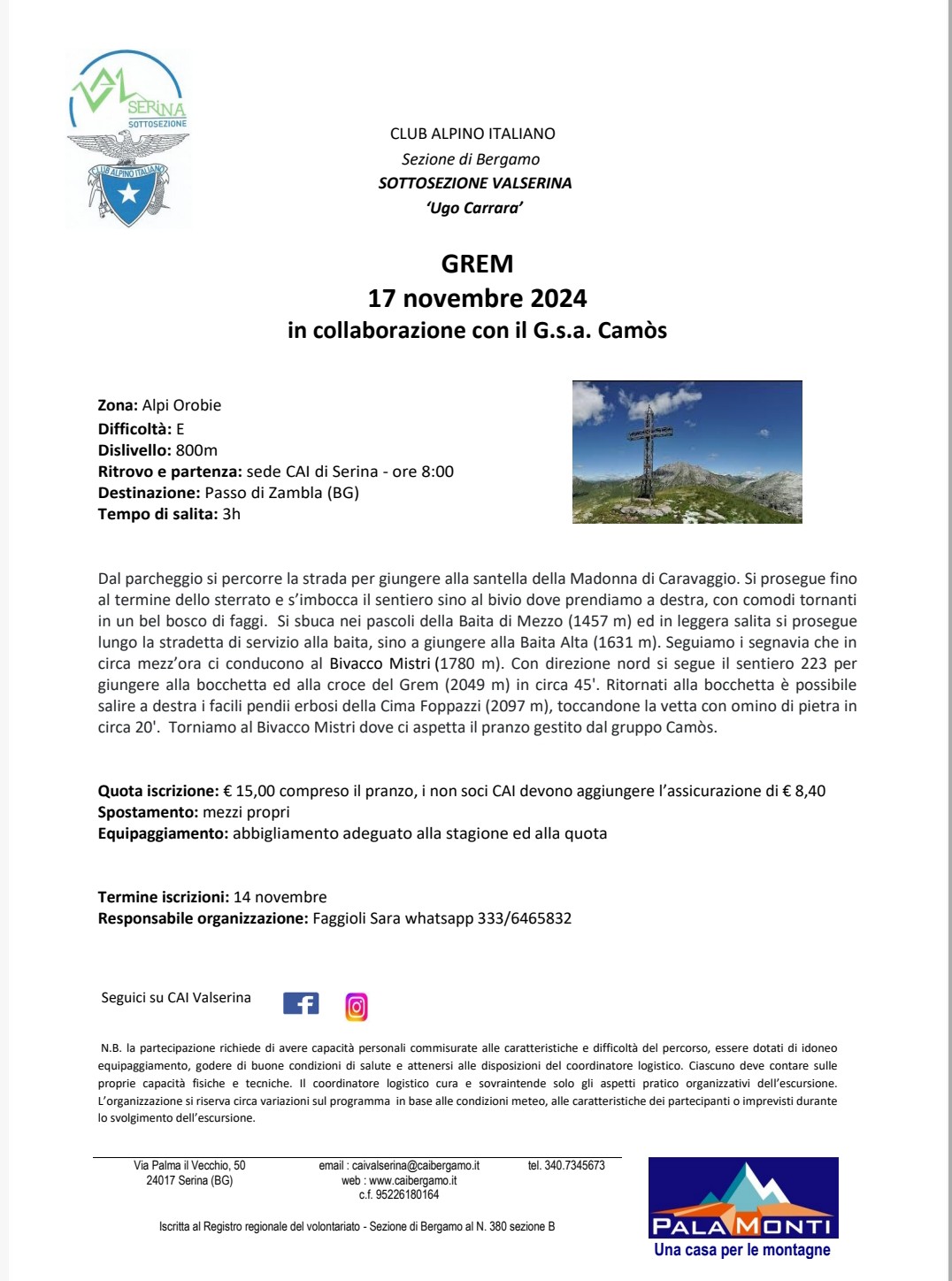 Sottosezione di Valserina Domenica 17 Novembre Cosa Uscita in ambiente Allegati Grem 2024.pdf Quando Quando Dom, 17/11/24, Tutto il giorno Partecipare Apertura delle iscrizioni Sab, 26/10/24 - Gio, 14/11/24, Tutto il giorno Se è indicata l'ora di chiusura delle iscrizioni, questa è tassativa Quote di partecipazione Socio CAI 15,00