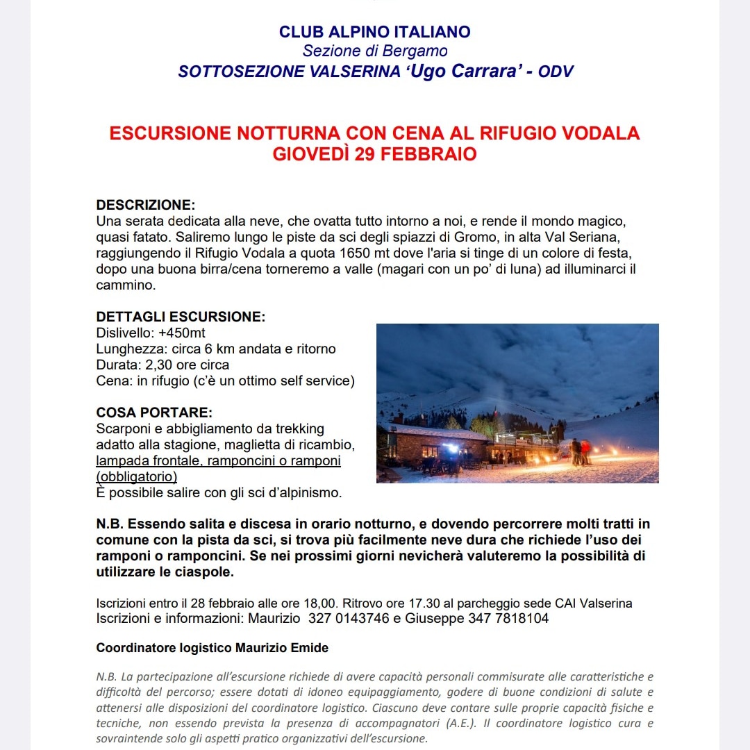 Sottosezione di Valserina Mercoledì 28 Febbraio Cosa Uscita in ambiente Allegati Vodala notturna 2024.pdf Quando Quando Mer, 28/02/24, Tutto il giorno Partecipare Apertura delle iscrizioni Dom, 25/02/24 - Mar, 27/02/24, Tutto il giorno Se è indicata l'ora di chiusura delle iscrizioni, questa è tassativa