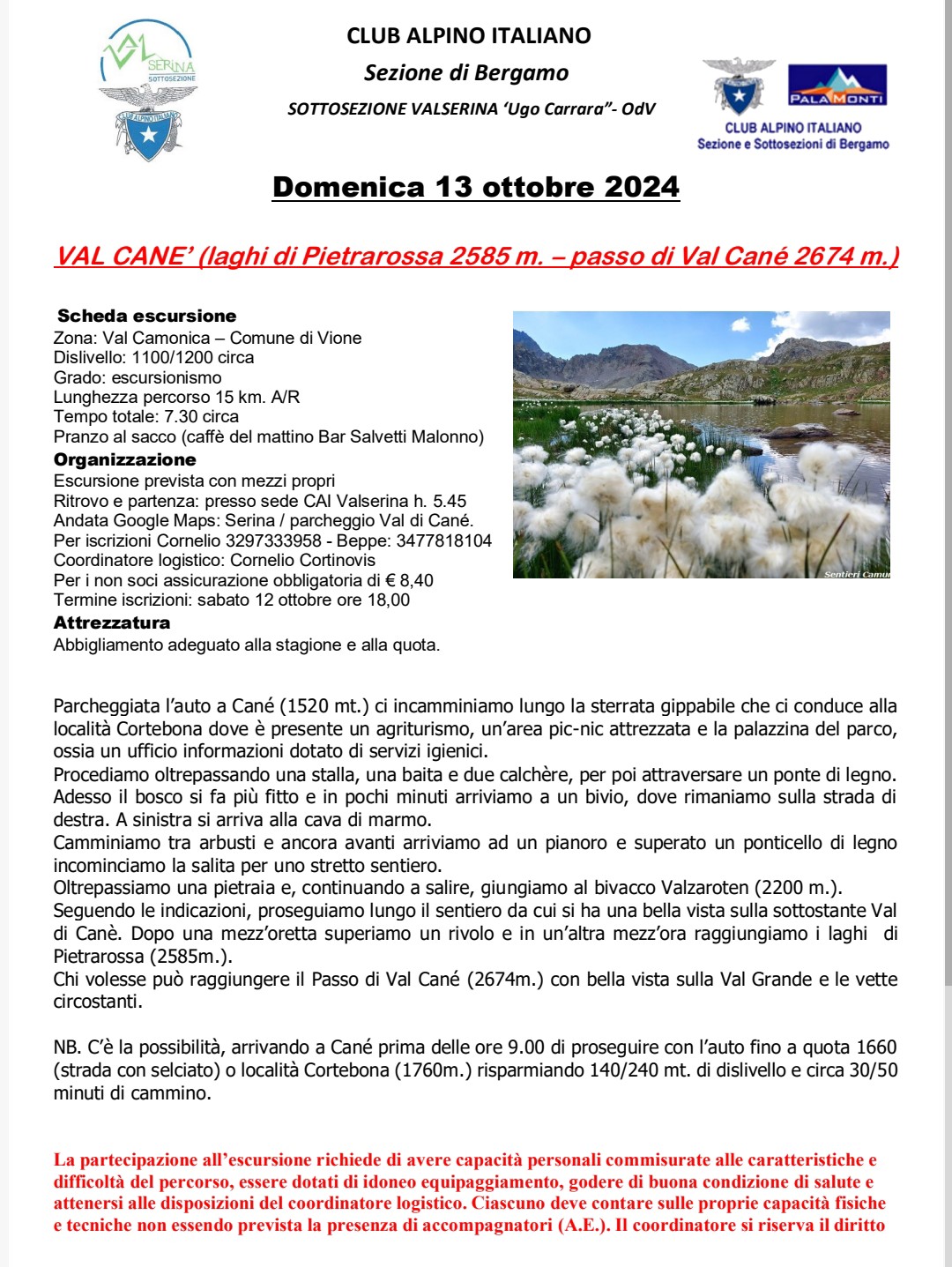Sottosezione di Valserina Domenica 13 Ottobre Cosa Uscita in ambiente Allegati Val Canè gita CAI 2024.pdf Quando Quando Dom, 13/10/24, Tutto il giorno Partecipare Apertura delle iscrizioni Mar, 01/10/24 - Sab, 12/10/24, Tutto il giorno Se è indicata l'ora di chiusura delle iscrizioni, questa è tassativa