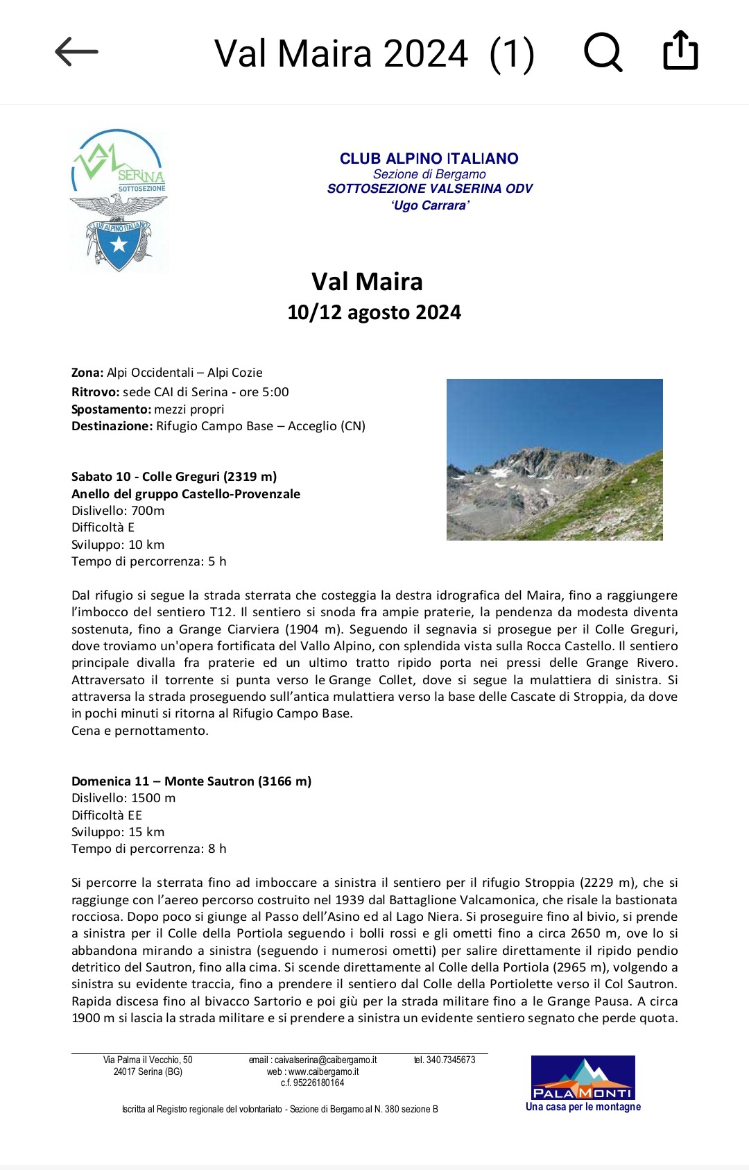 Sottosezione di Valserina Da Sabato 10 Agosto Cosa Uscita in ambiente Allegati Val Maira 2024.pdf Quando Quando Sab, 10/08/24 - Lun, 12/08/24, Tutto il giorno Partecipare Apertura delle iscrizioni Mar, 21/05/24 - Ven, 09/08/24, Tutto il giorno Se è indicata l'ora di chiusura delle iscrizioni, questa è tassativa